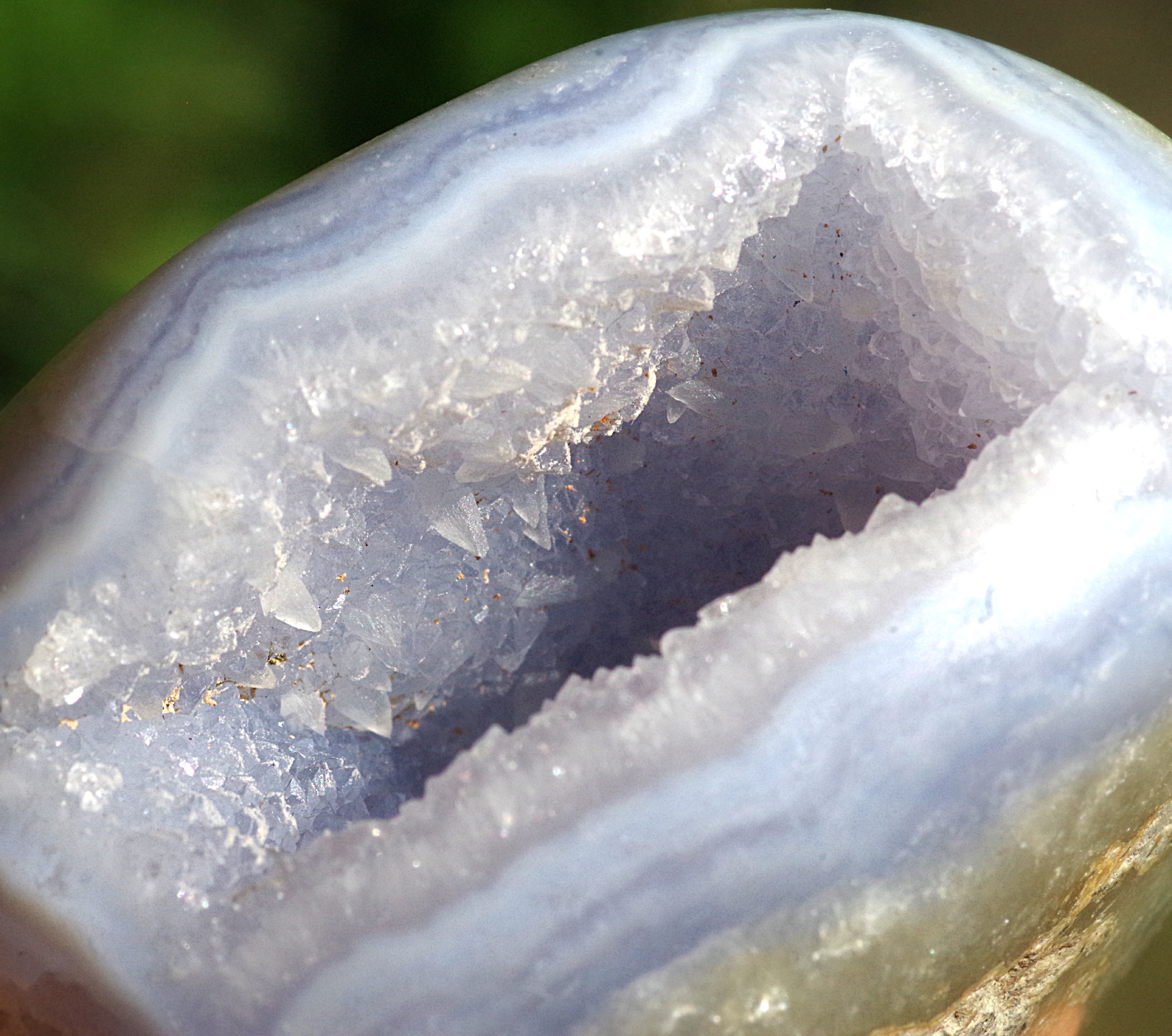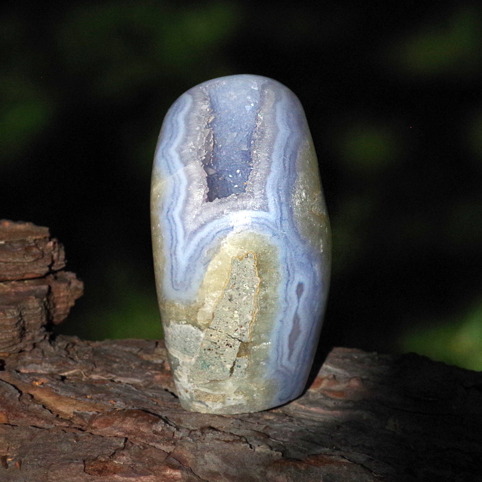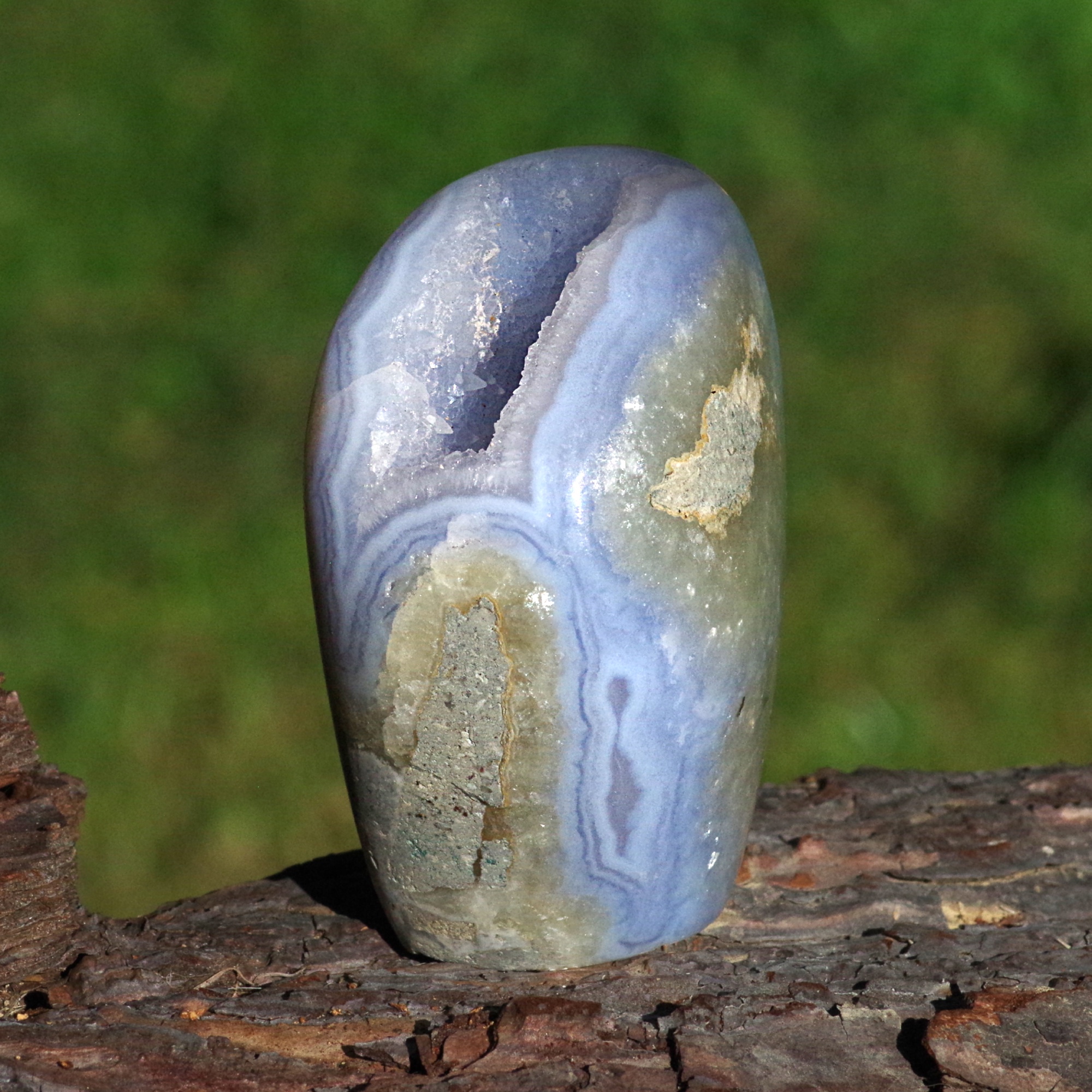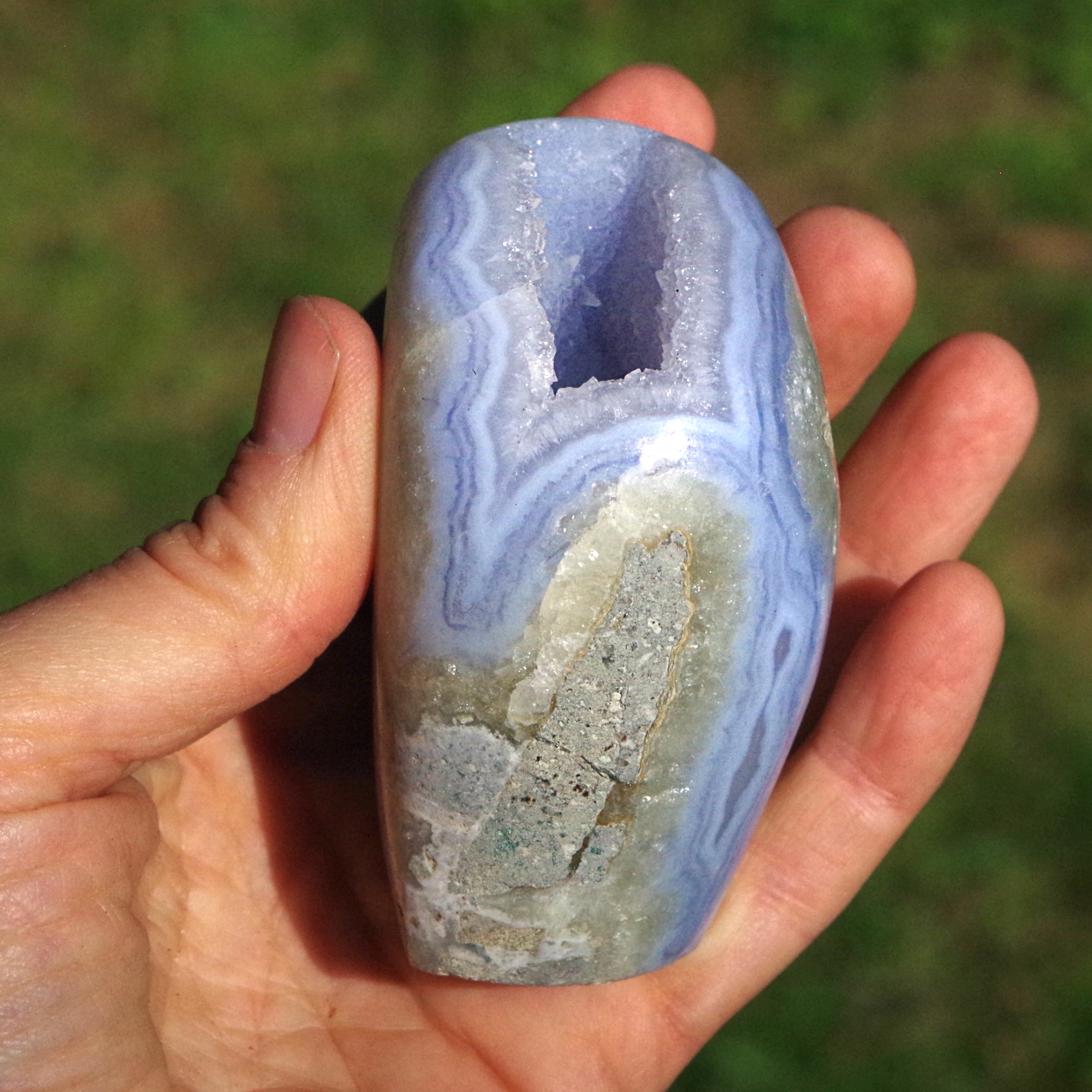 A fabulous polished Blue Lace Agate in matrix that is self standing and has beautiful light blue and white banding. A large cavity opens up to reveal and deep pocket filled with bright, blue tinged drusy quartz, and some perfectly formed small white calcite crystals. This is a high quality beautiful specimen from Nsanje, Malawi that is both decorative and very collectable.