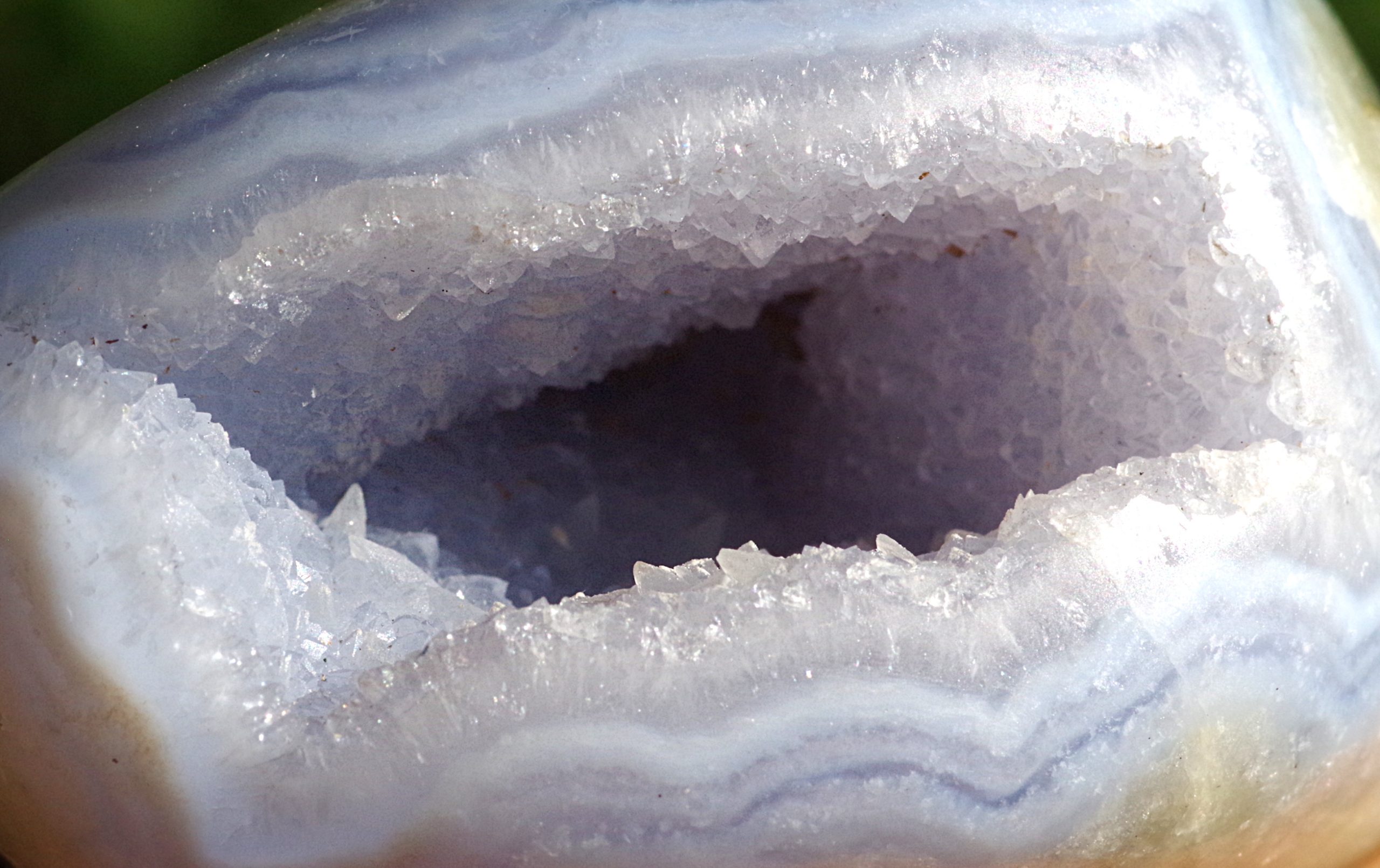 El ágata de encaje azul es una variedad delicada de calcedonia bandeada, una forma microcristalina de cuarzo, conocida por sus suaves tonos azules y delicados patrones de encaje. Este material, procedente de Malawi , es especialmente apreciado por su sutil coloración y sus finas bandas naturales, formadas durante largos periodos a medida que fluidos ricos en sílice cristalizaban lentamente en la roca volcánica.