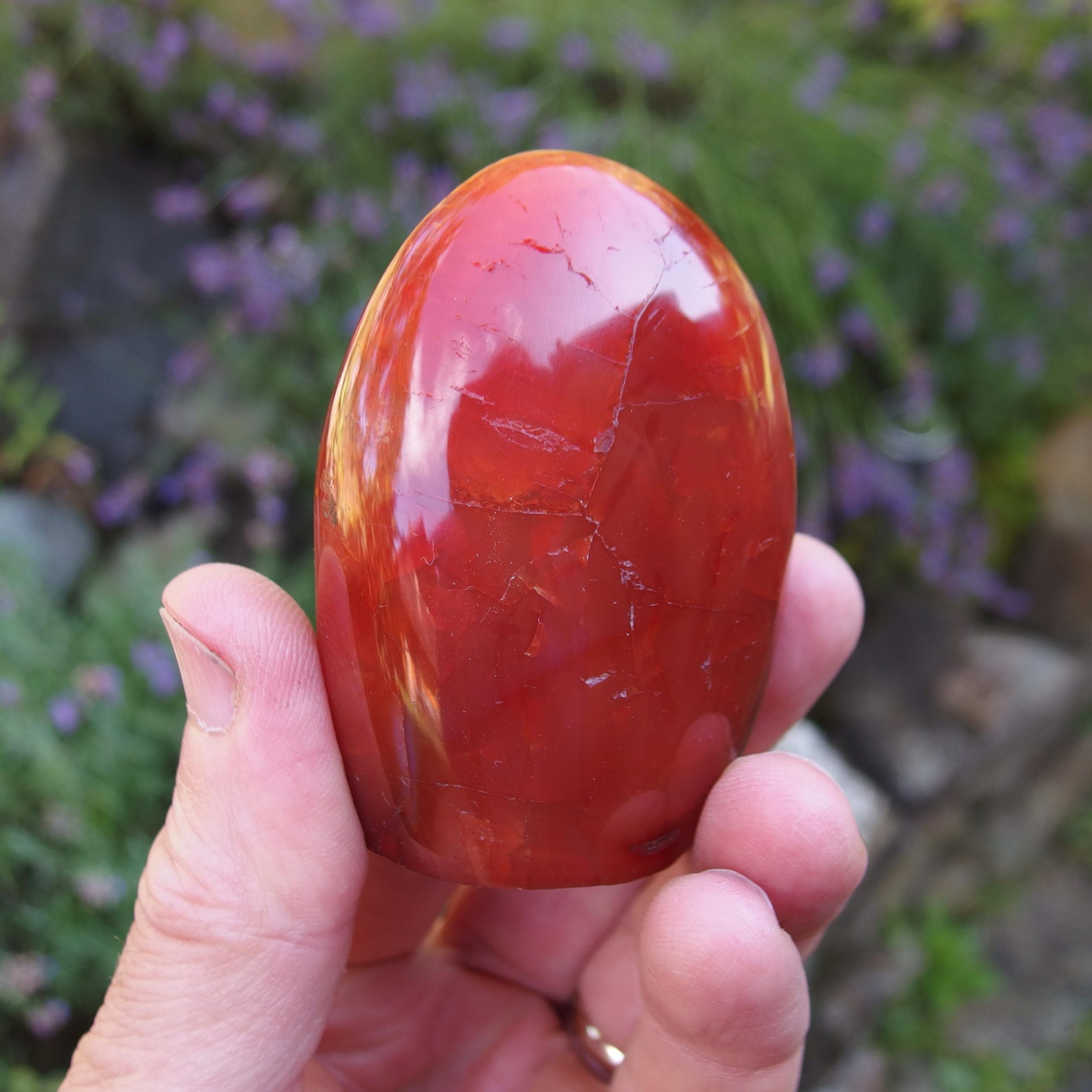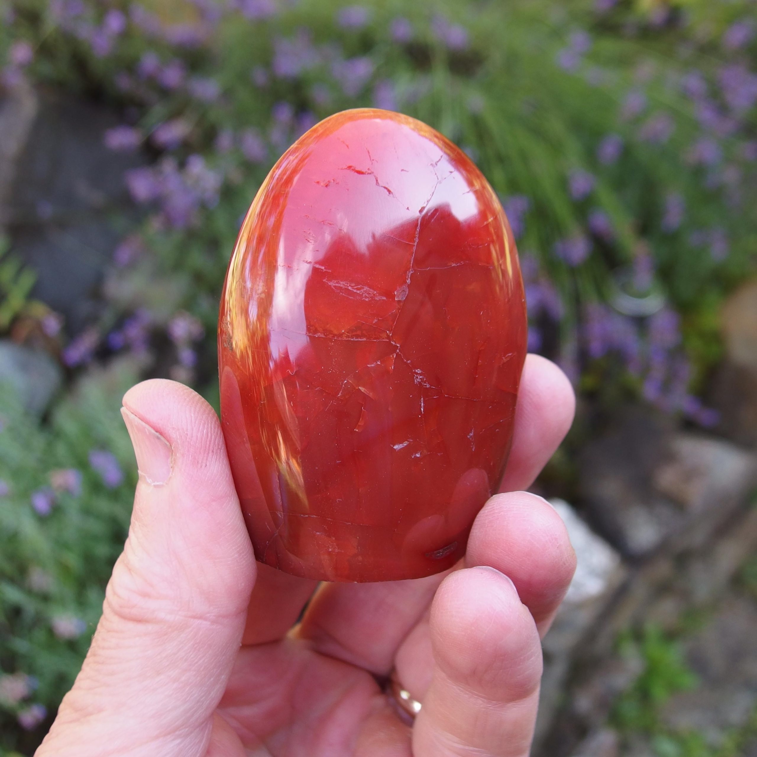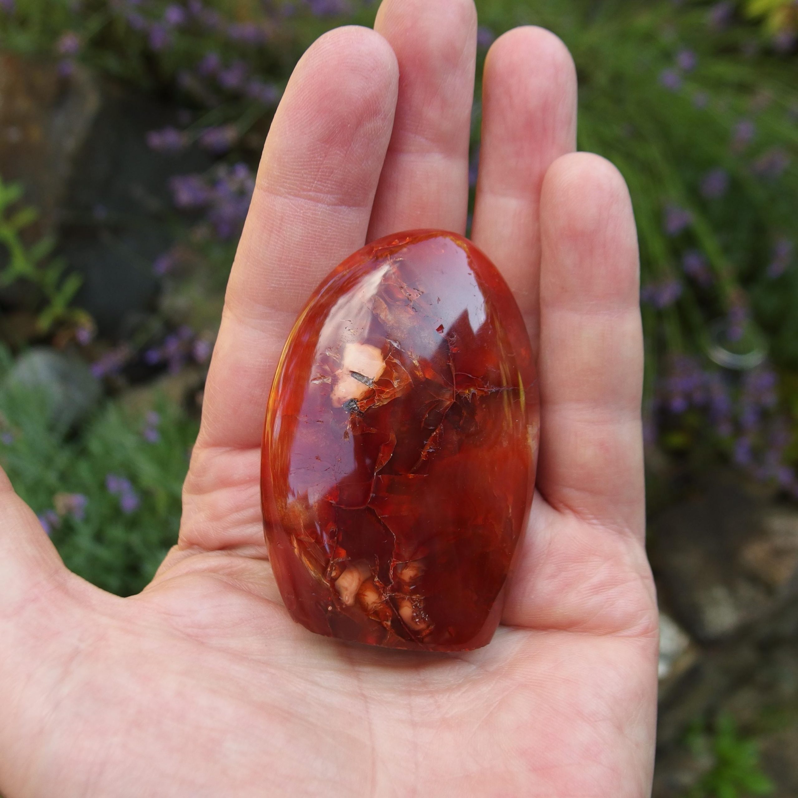 Una vibrante gema de cornalina pulida que se sostiene por sí sola, con una hermosa combinación de cálidos tonos naranja y rojo. Entre sus maravillosos patrones y espirales, se encuentran zonas translúcidas de alta calidad. La cornalina de Madagascar es la piedra perfecta para empezar el día con energía.