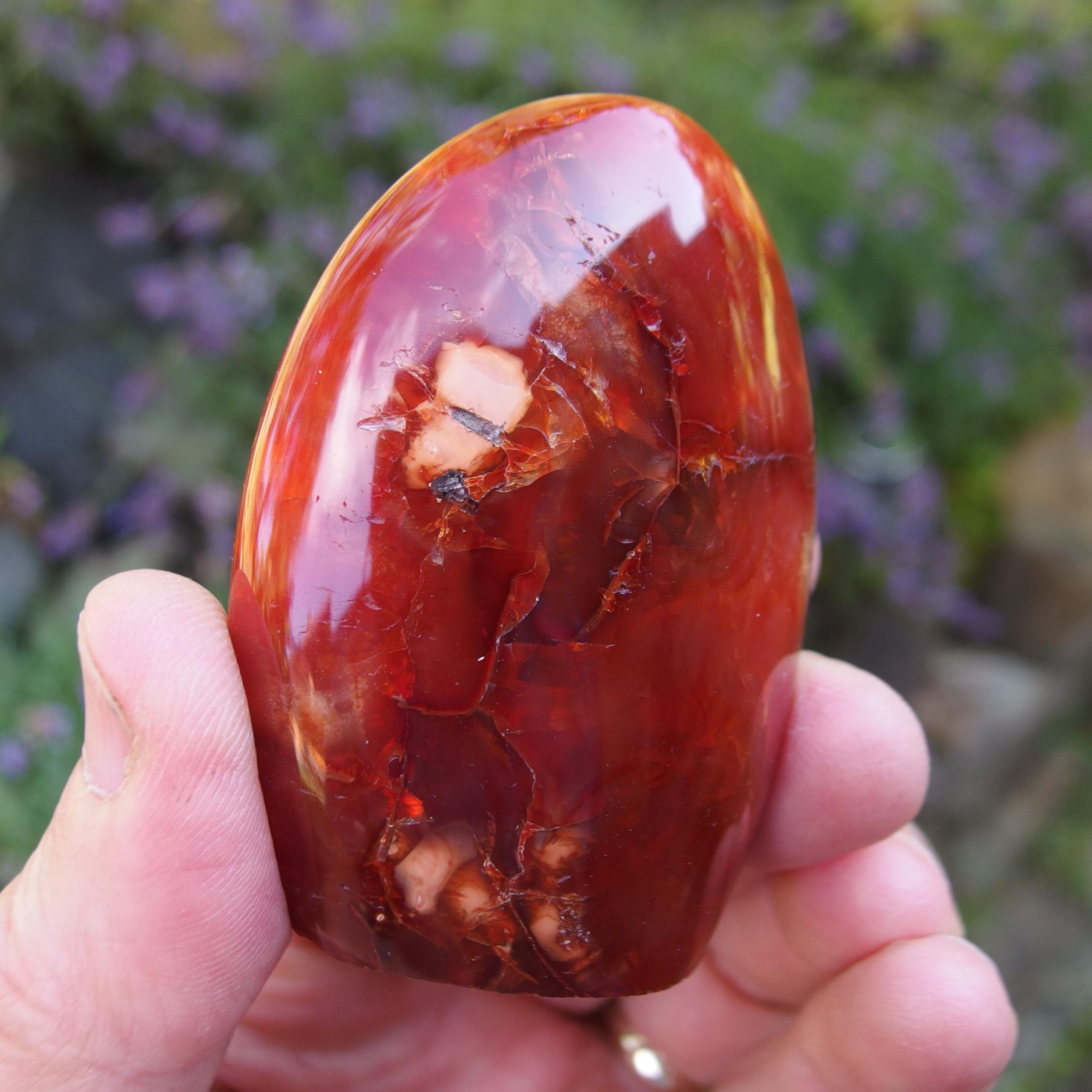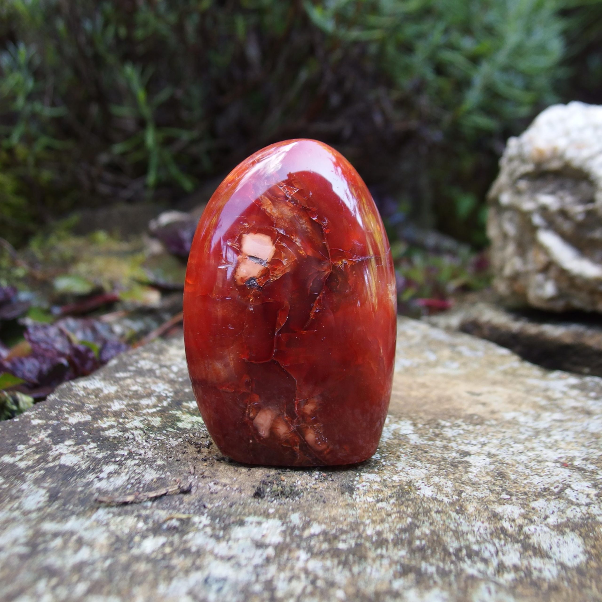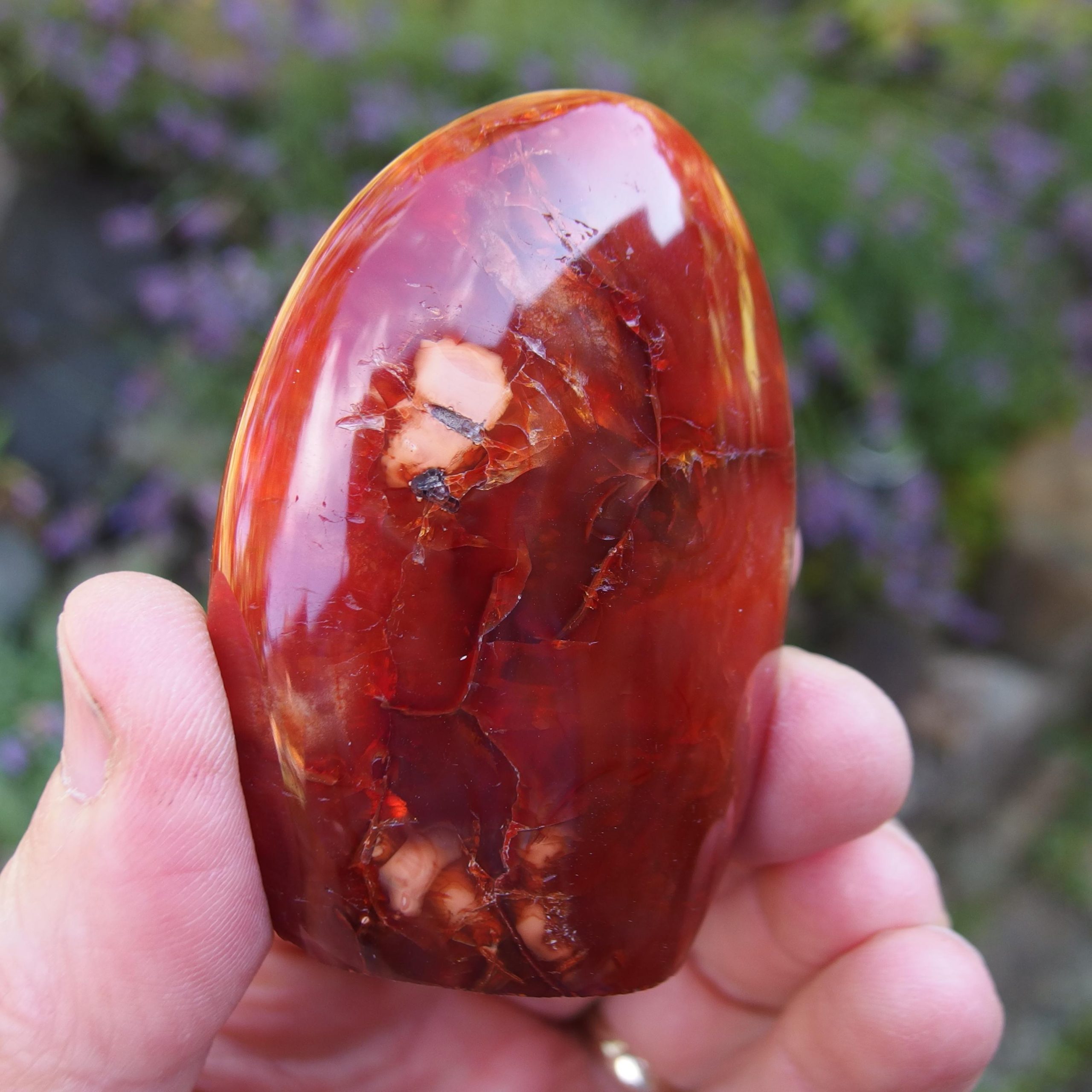Una vibrante gema de cornalina pulida que se sostiene por sí sola, con una hermosa combinación de cálidos tonos naranja y rojo. Entre sus maravillosos patrones y espirales, se encuentran zonas translúcidas de alta calidad. La cornalina de Madagascar es la piedra perfecta para empezar el día con energía.