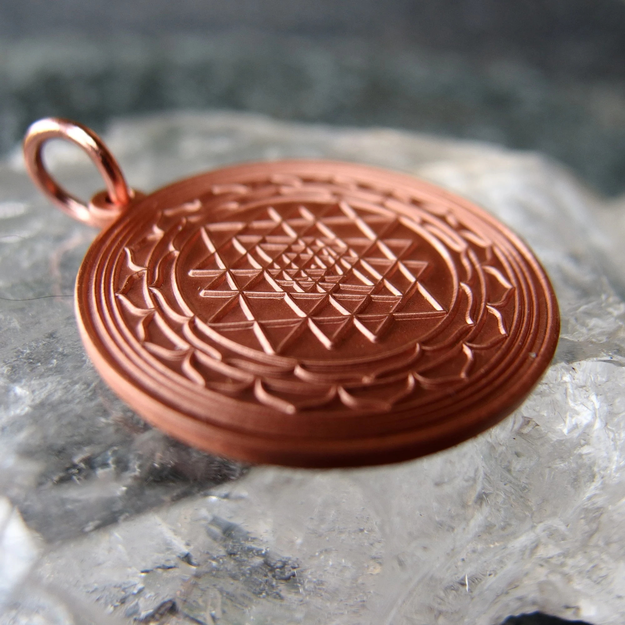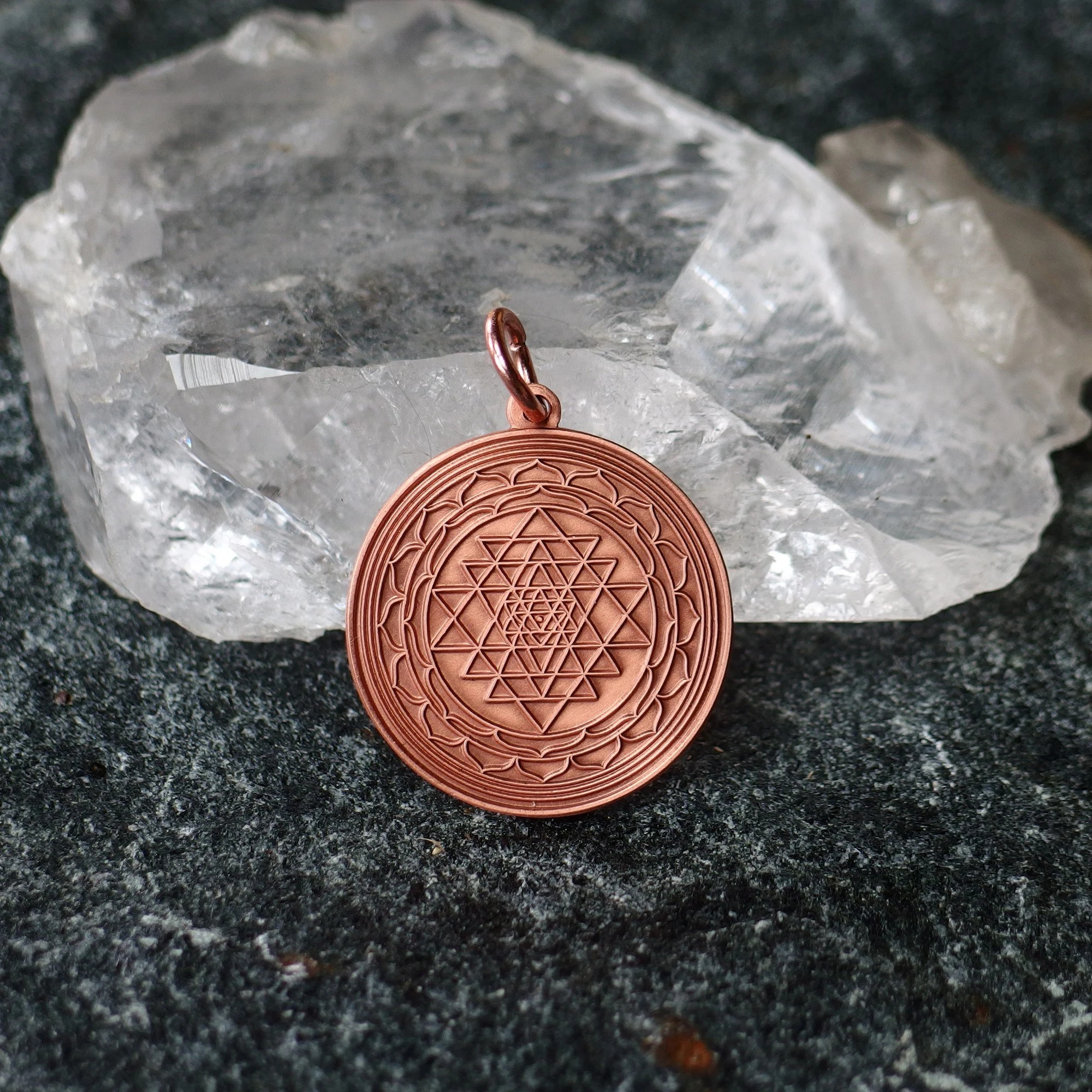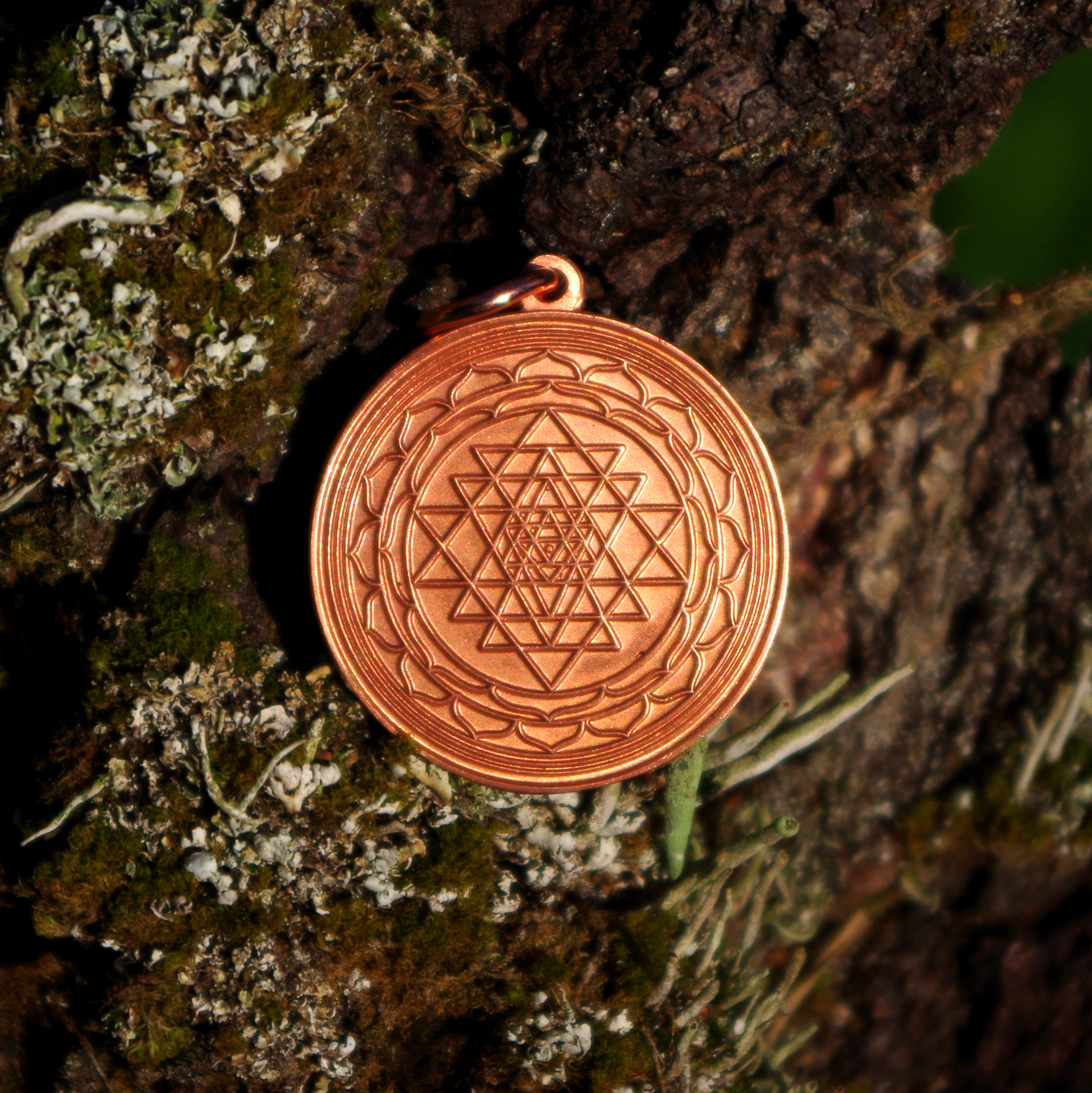 This precise copper Shree Yantra Pendant have been activated in a sacred power point with mantra and fire. The Shri Yantra is an ancient symbol of harmony and union that draws in great healing and Light. Wear these pendants for protection, to help raise consciousness, promote good health and manifest material and spiritual prosperity. They are constantly emanating the highest vibrations and prana. Best worn at the heart level near the thymus gland.