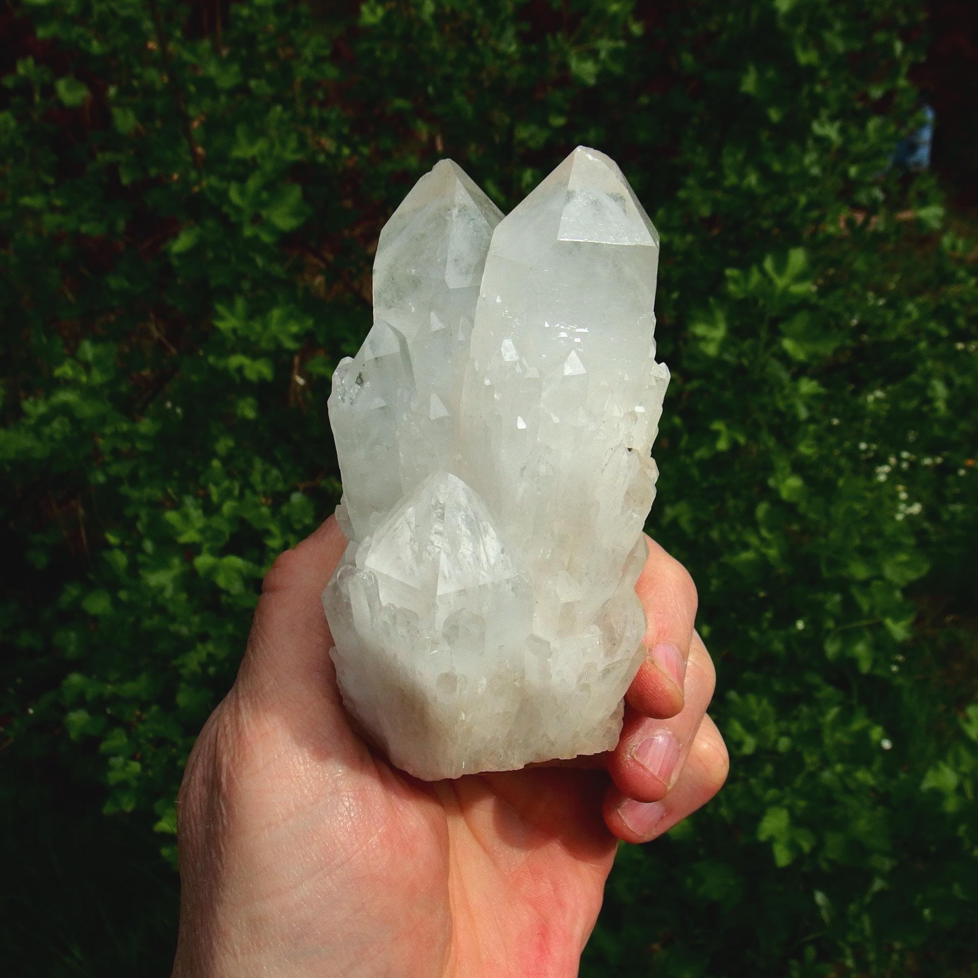Un cristal de Cuarzo Azucarado de alta calidad con una fabulosa formación de alcachofa o piña, donde crecen cristales más pequeños alrededor del cuerpo de los cristales progenitores. Los dos cristales más grandes presentan fantasmas blancos claramente visibles en su interior, mientras que las terminaciones restantes presentan una claridad excelente. También presenta cierta autocuración en la base del cristal, donde en algún momento de su crecimiento se separó de la matriz y se curó a sí mismo. Todo el conjunto de cristales presenta un brillo intenso y se encuentra en muy buen estado. Presenta algunos daños en las puntas de cristal más grandes, y aunque esto no afecta su belleza, se ha tenido en cuenta al fijar el precio.