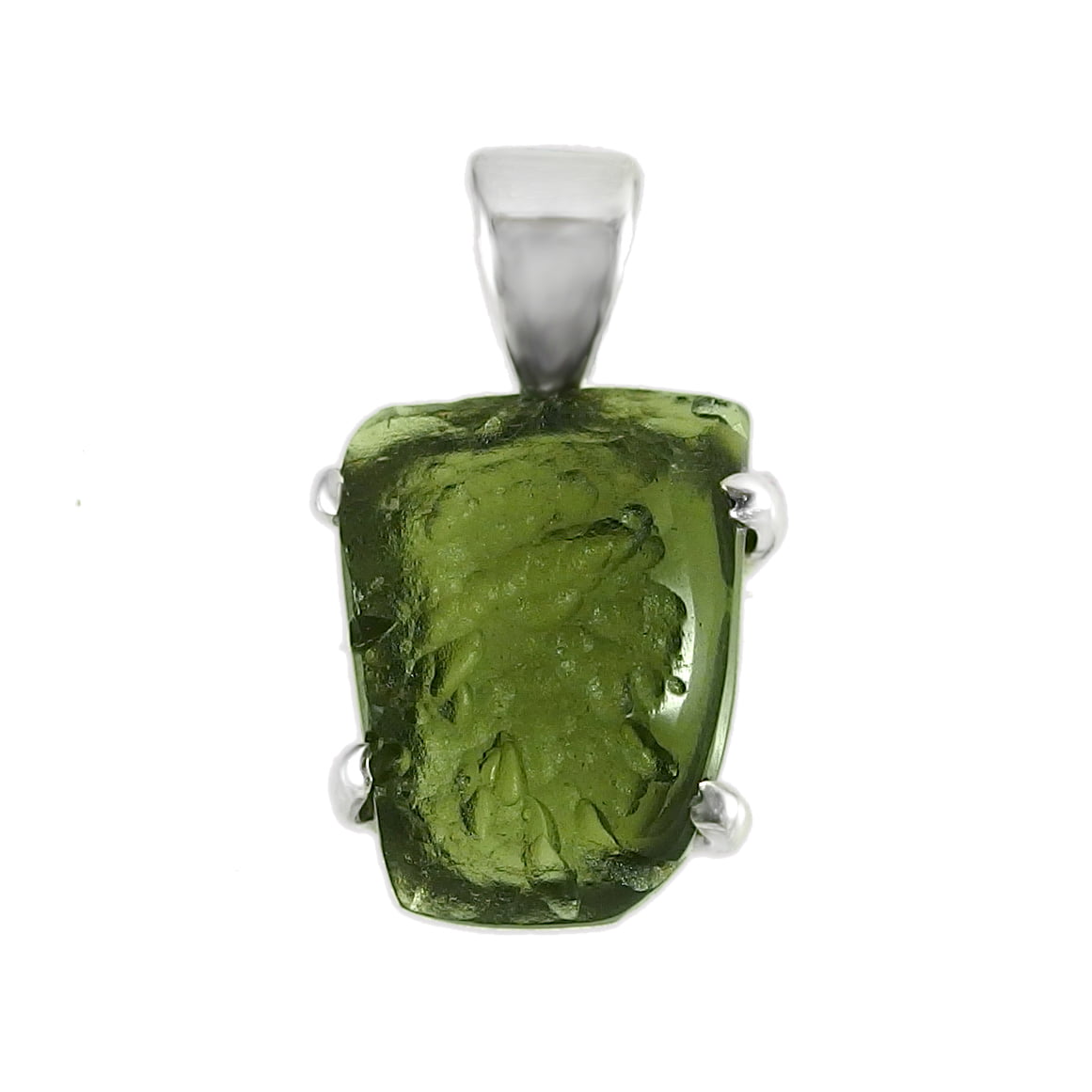 Cette pierre de moldavite naturelle de qualité AA est magnifiquement mise en valeur par un sertissage classique à griffes, laissant ainsi s'exprimer pleinement la texture exceptionnelle de sa surface et sa riche couleur verte. La moldavite présente un dos poli et une face avant naturelle, permettant à la lumière de pénétrer en profondeur. Ce pendentif est idéal à porter au niveau du chakra du cœur ou de la gorge pour favoriser la guérison émotionnelle et spirituelle. La moldavite apporte la transformation à tous les niveaux et est réputée pour ses propriétés métaphysiques et ses connexions interplanétaires.