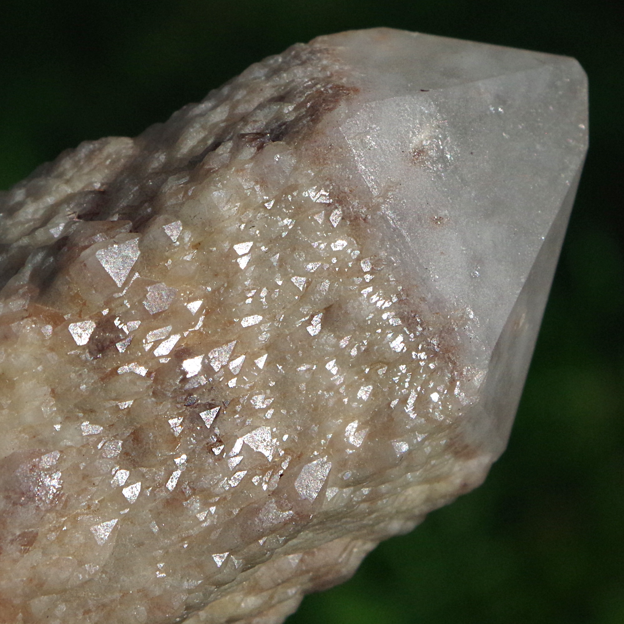 Le quartz céleste , également appelé quartz ananas , est une formation de quartz remarquable de Madagascar. Il se caractérise par un grand cristal « mère » central entouré d'innombrables cristaux plus petits qui se développent en couches étagées. Cette structure naturelle se développe sur de longues périodes, le quartz cristallisant de manière répétée autour du noyau principal, ce qui lui confère son aspect distinctif d'ananas et ses détails complexes.