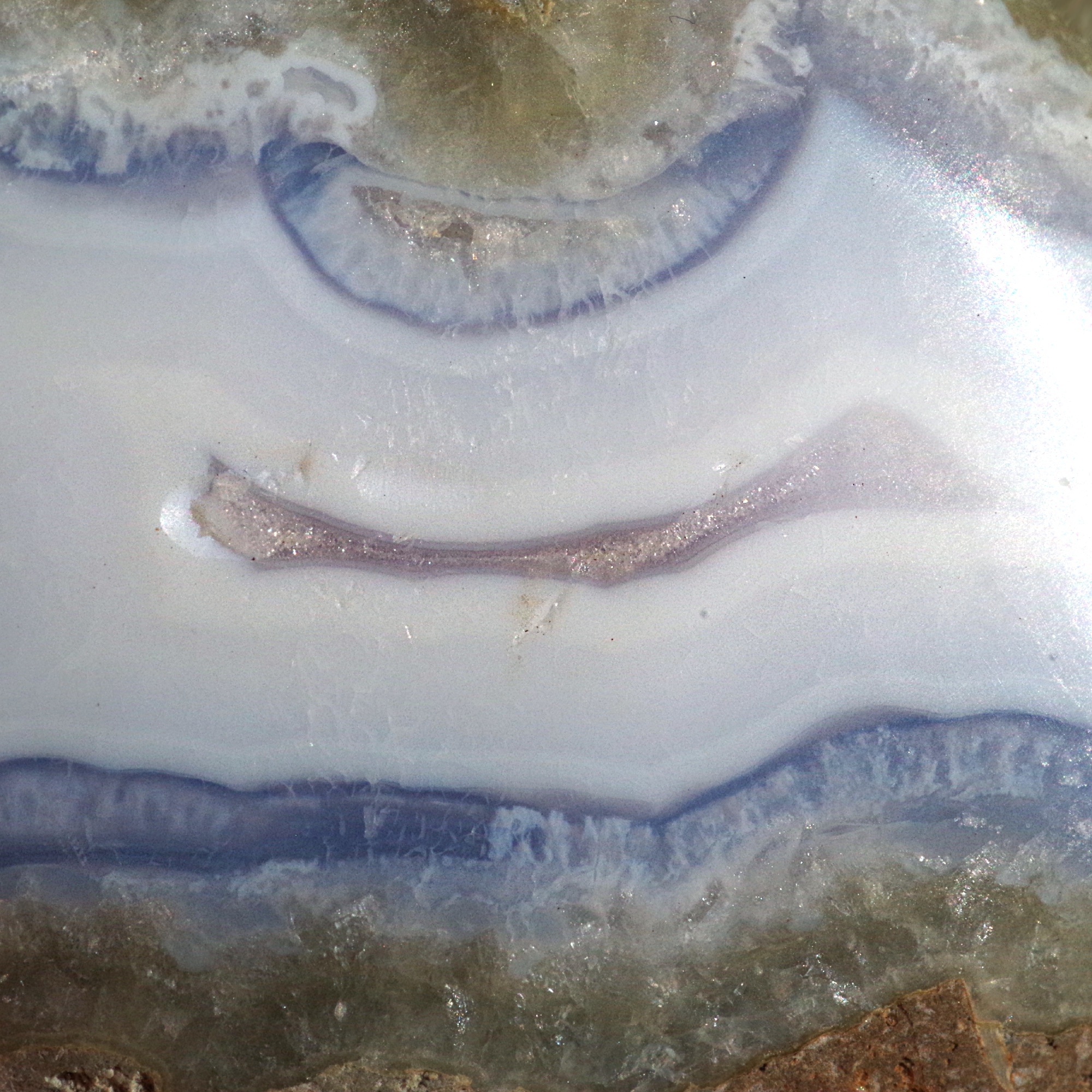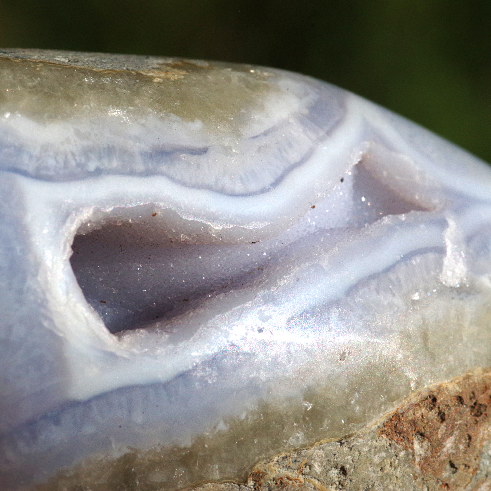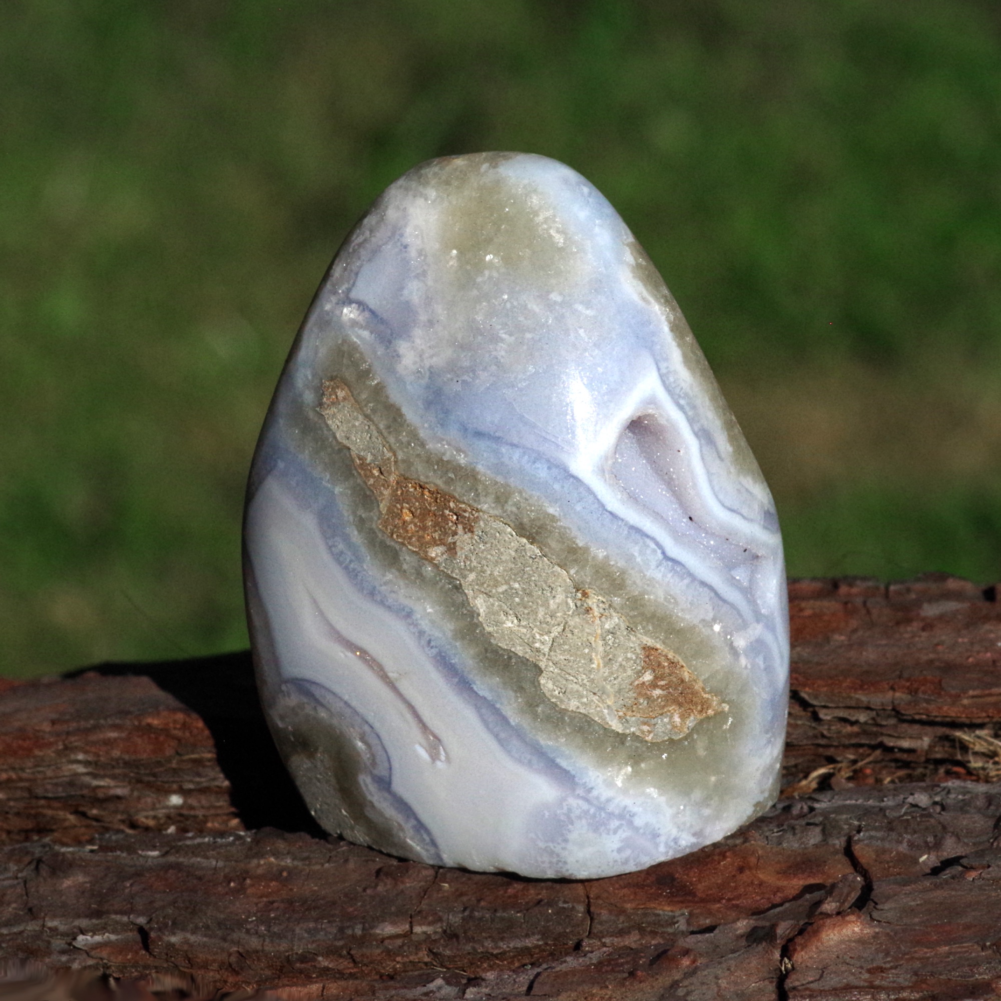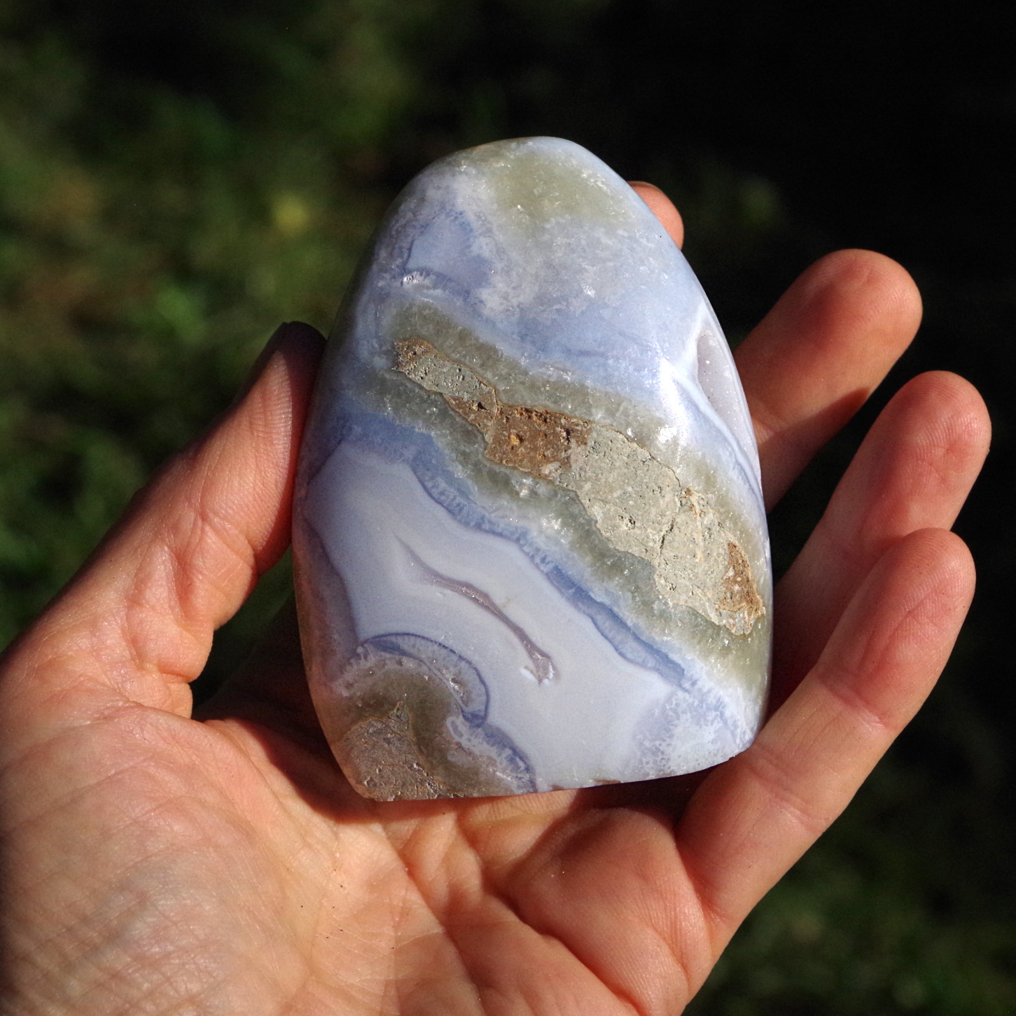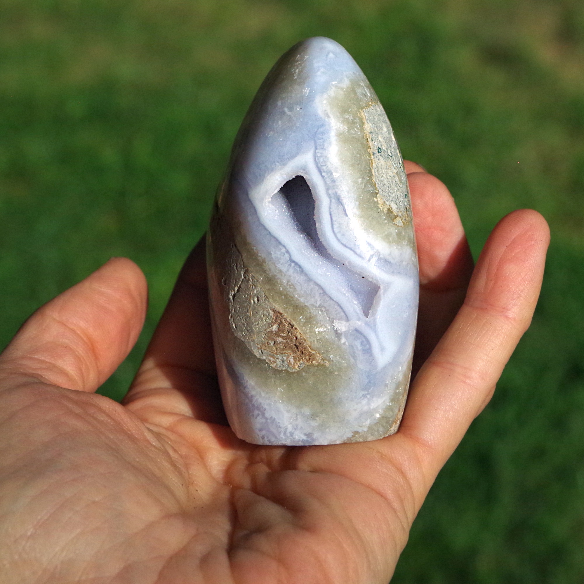 L'agate dentelle bleue est une variété délicate de calcédoine rubanée, une forme microcristalline de quartz, réputée pour ses douces nuances de bleu et ses motifs délicats évoquant la dentelle. Provenant du Malawi , elle est particulièrement appréciée pour sa coloration subtile et ses fines bandes naturelles, formées sur de longues périodes par la lente cristallisation de fluides riches en silice au sein de roches volcaniques.