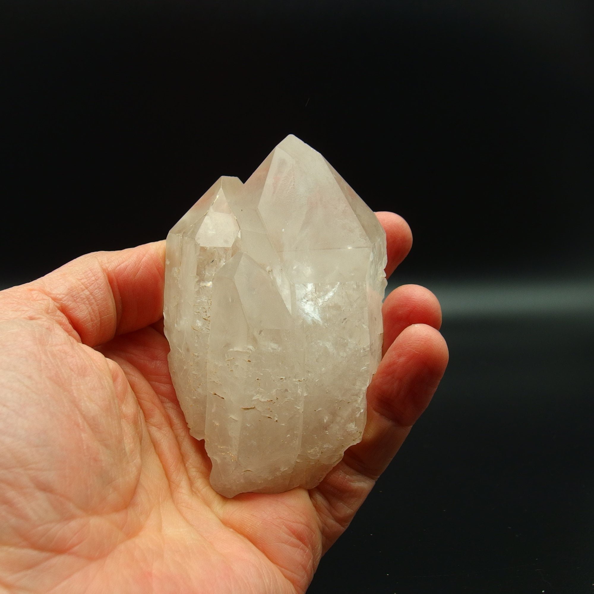 Un magnifique quartz triple cristal limpide de Serenje, en Zambie, aux multiples reflets irisés. Nous apprécions les cristaux de quartz de Serenje pour leur énergie joyeuse et la lumière qu'ils dégagent. La face principale de cette grande pointe de cristal possède sept côtés, et sa face opposée présente une gravure en forme de clé.