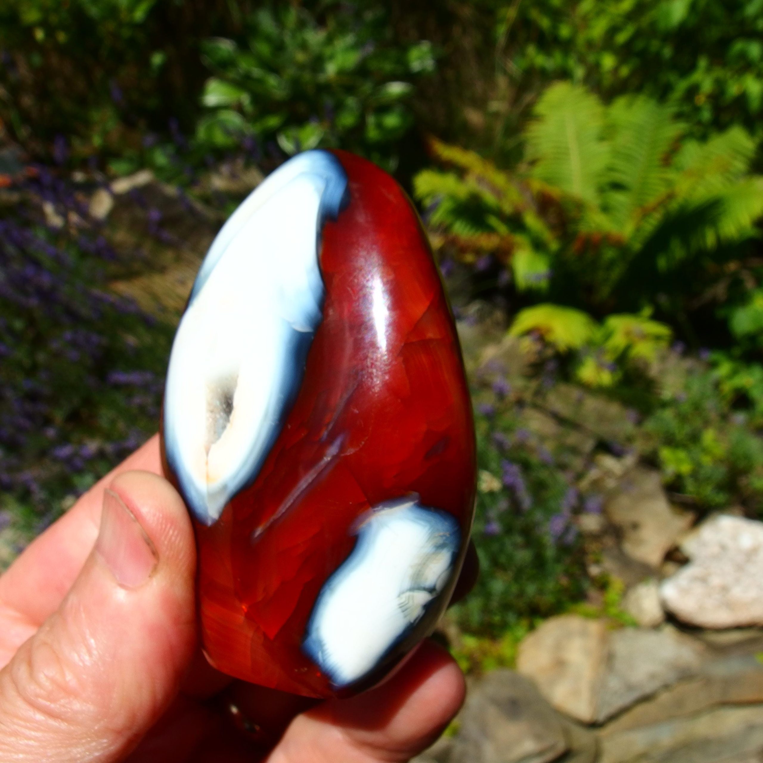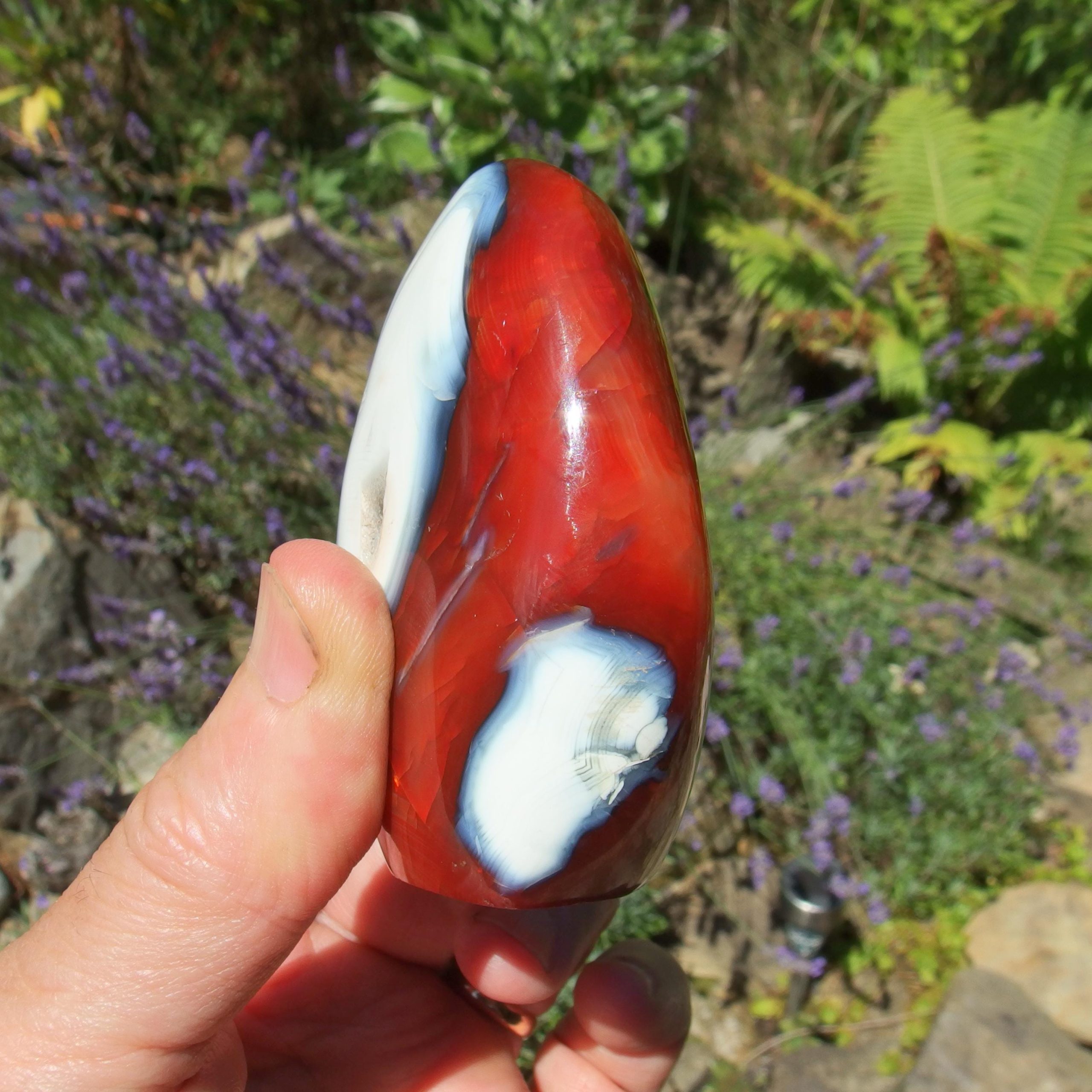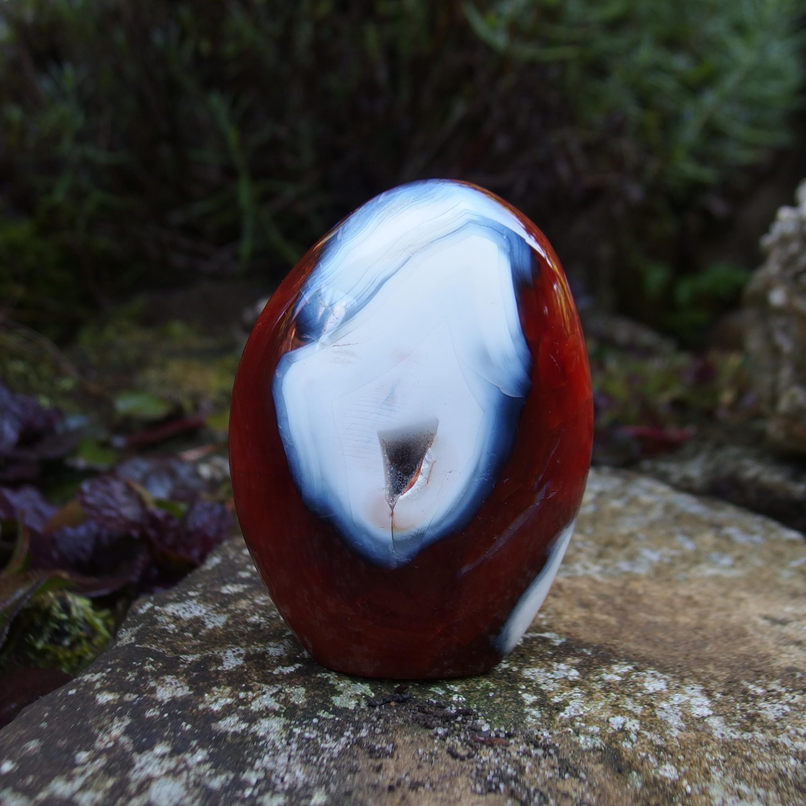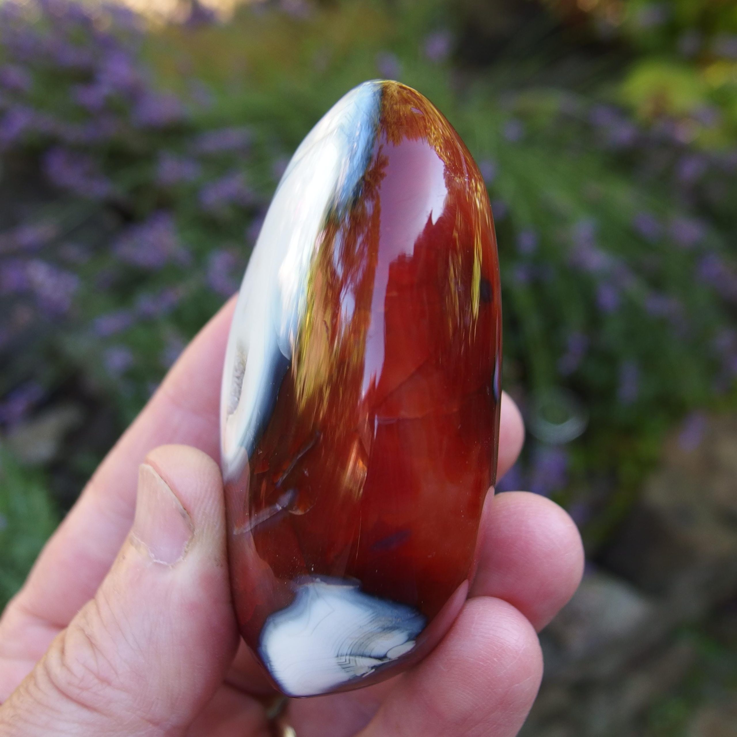 A beautiful Carnelian freeform polish from Madagascar, with a lovely contrast of orangey-red colours and white Agate banding. Within the middle of the white is an area of druzy crystals.