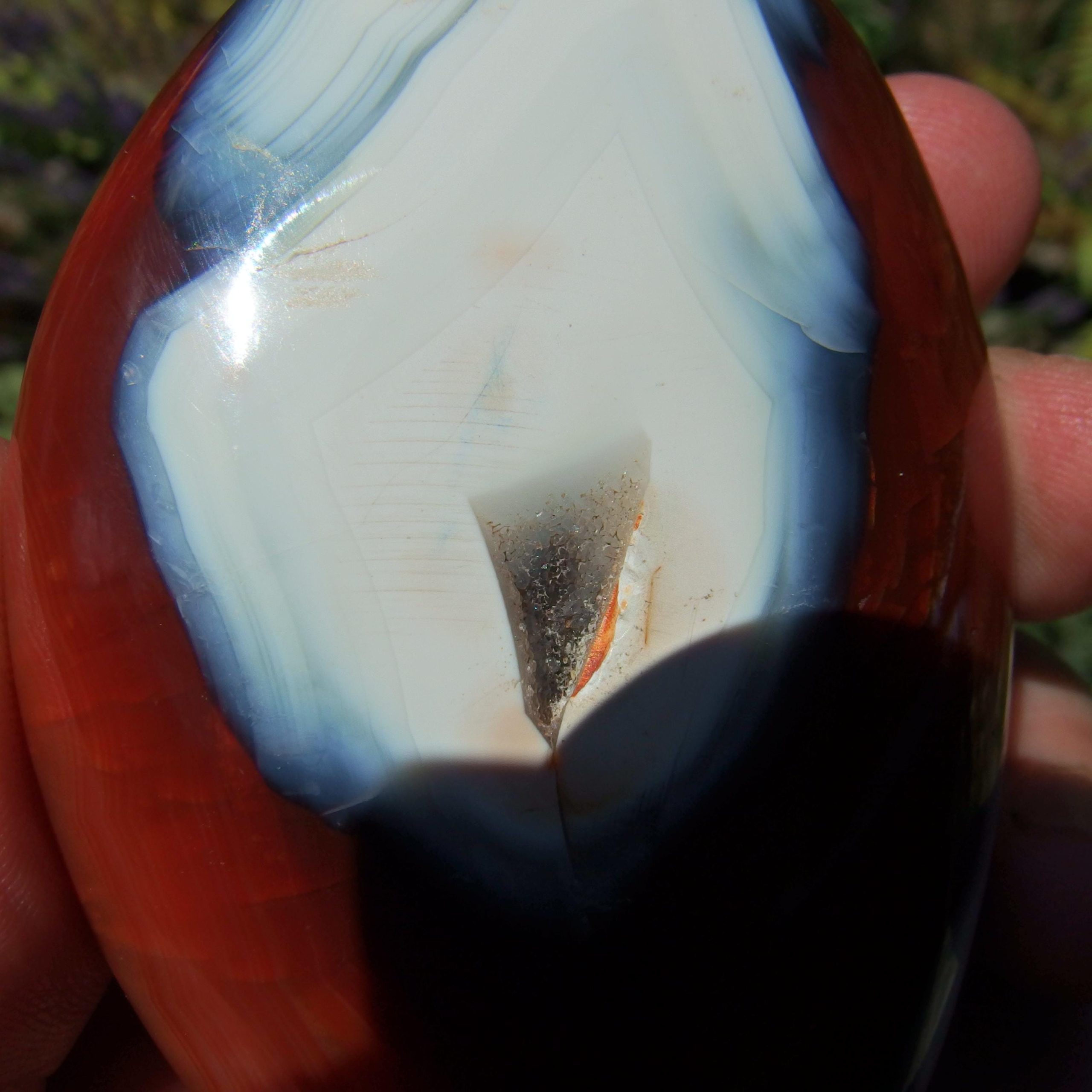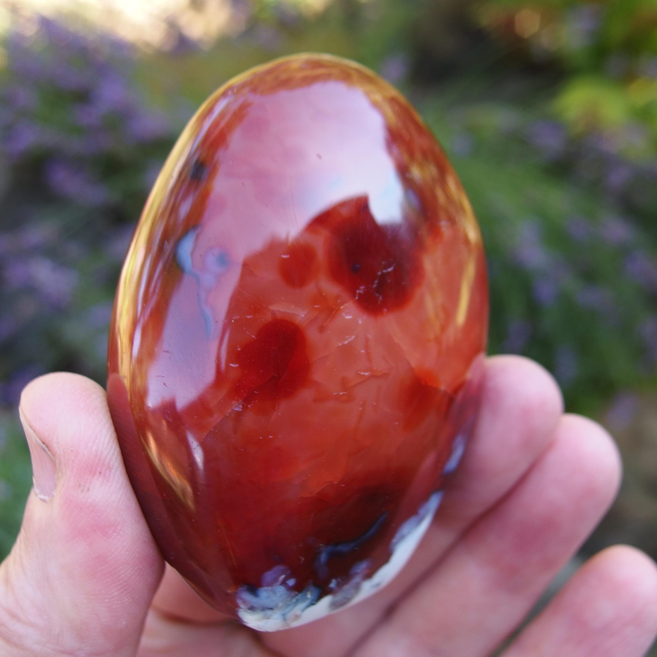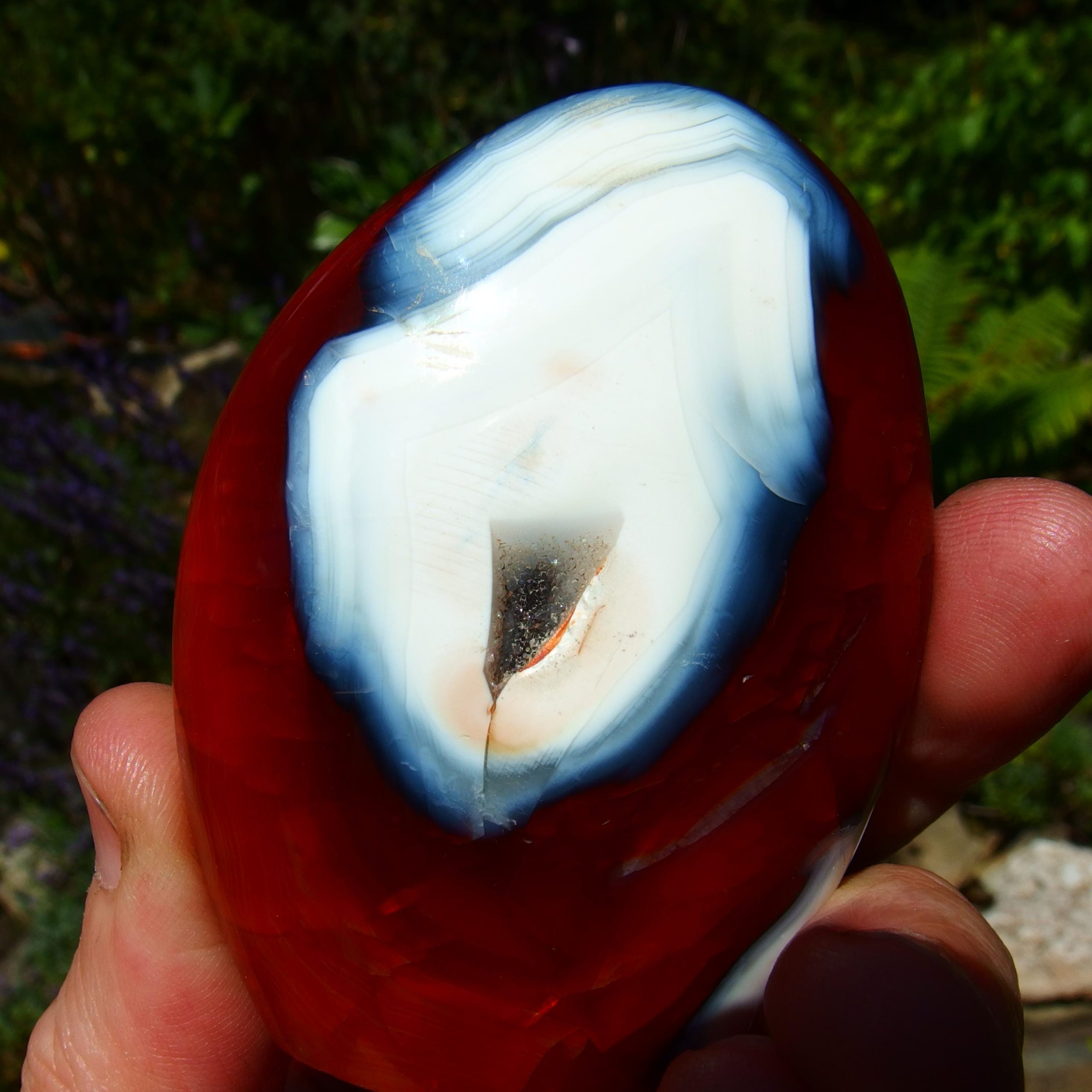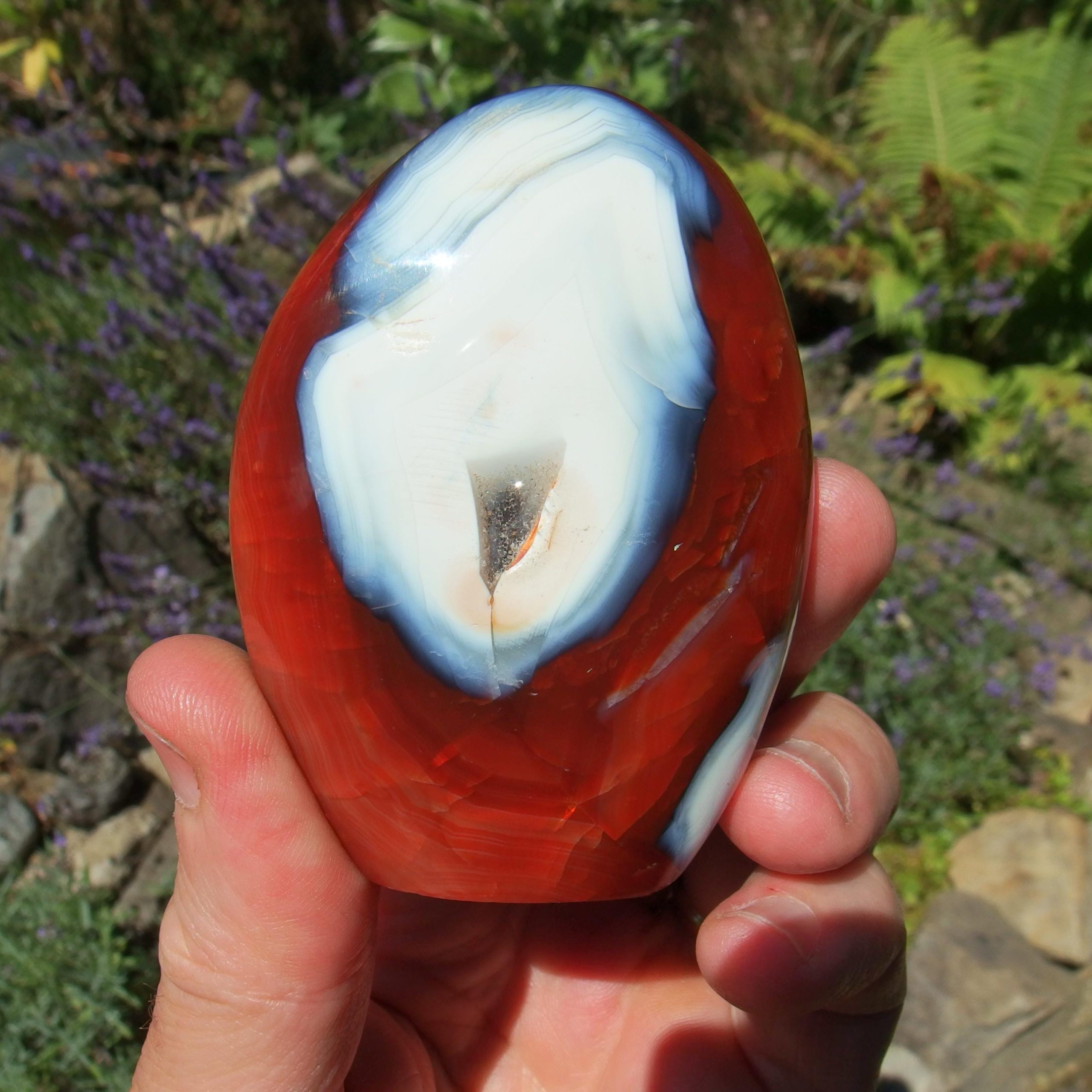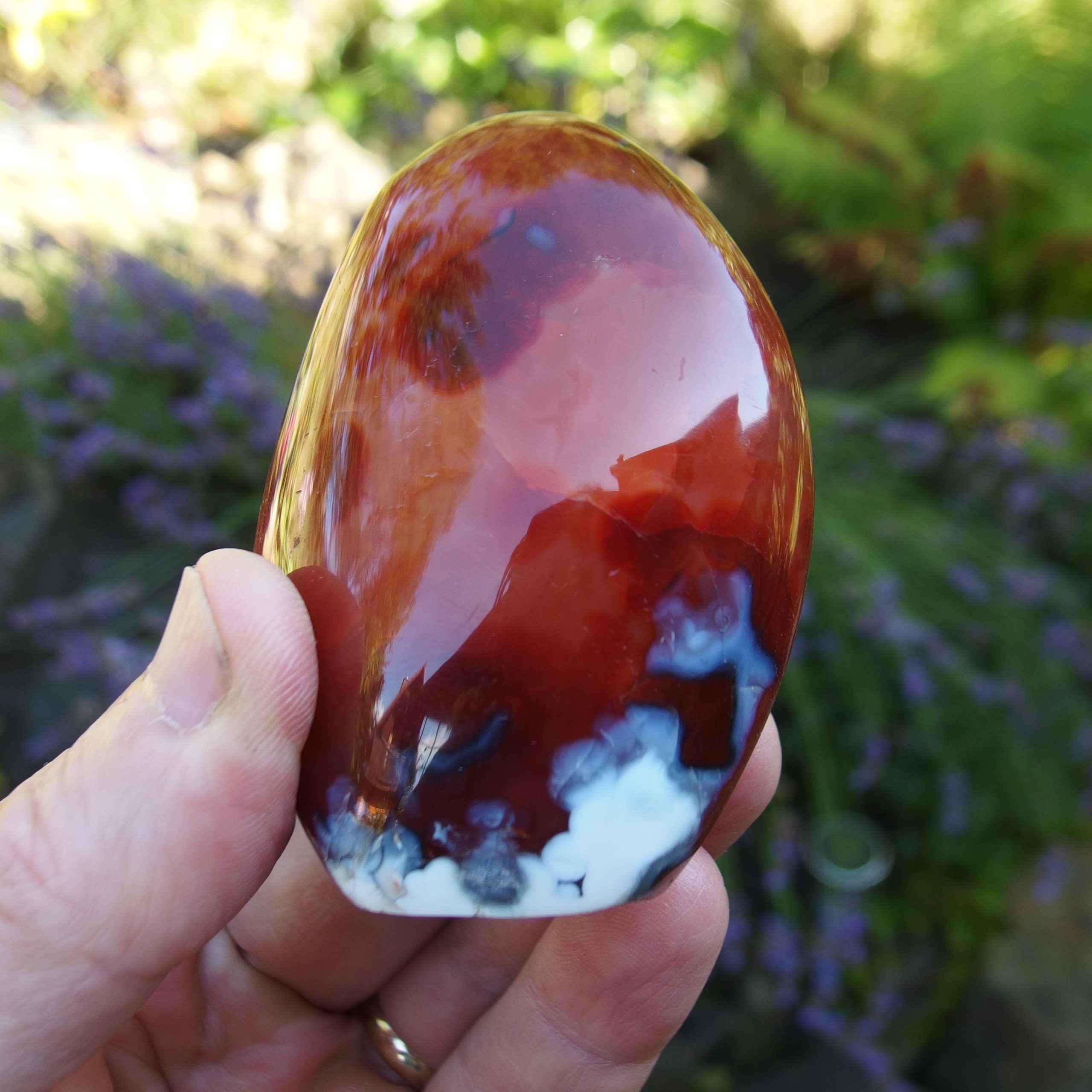 A beautiful Carnelian freeform polish from Madagascar, with a lovely contrast of orangey-red colours and white Agate banding. Within the middle of the white is an area of druzy crystals.