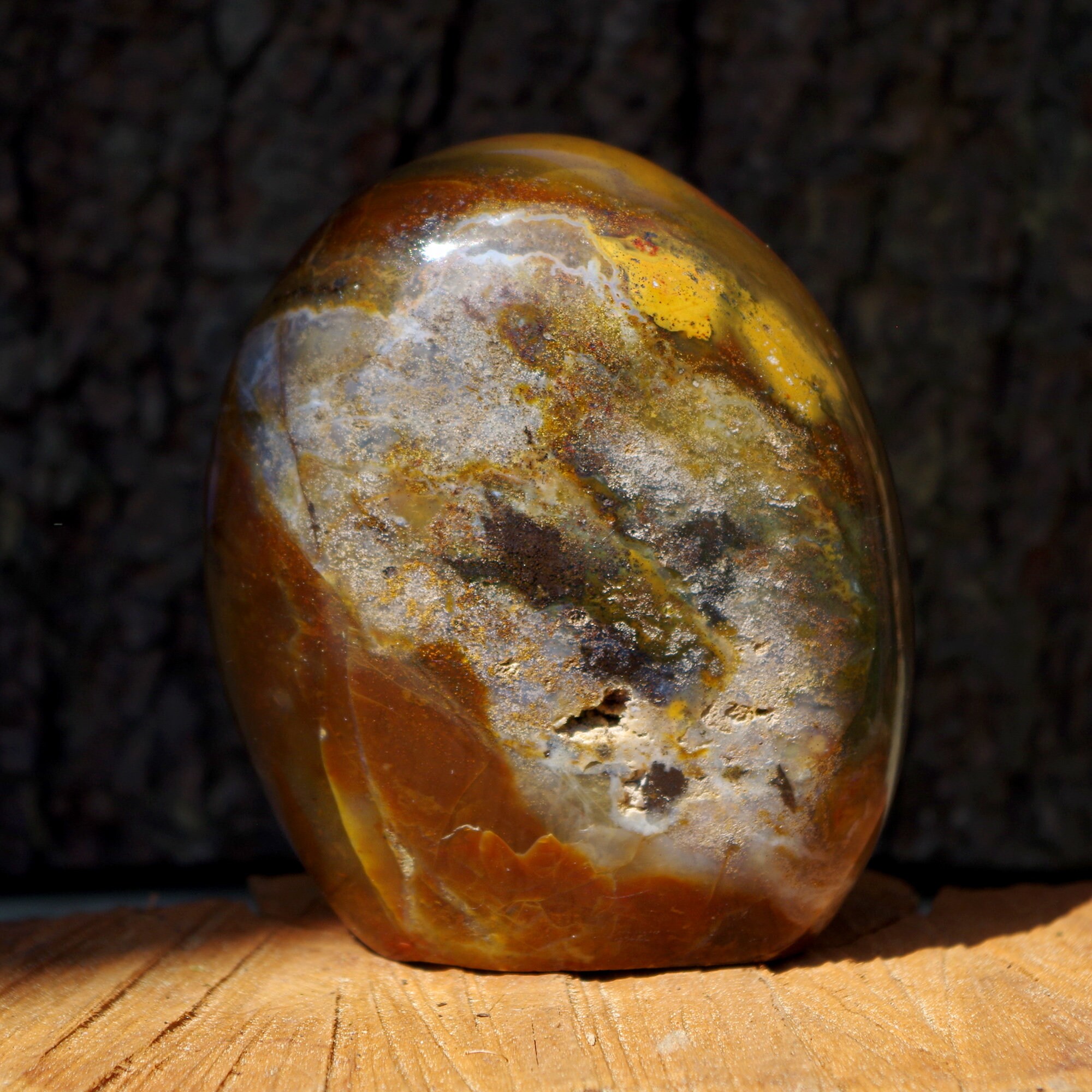 A gorgeous Ocean Jasper polished stone with mixed hues of red, green, yellow and brown colors. There are some areas also of translucent Agate to add to its beauty. A special self-standing stone from Madagascar that would make a wonderful housewarming gift.