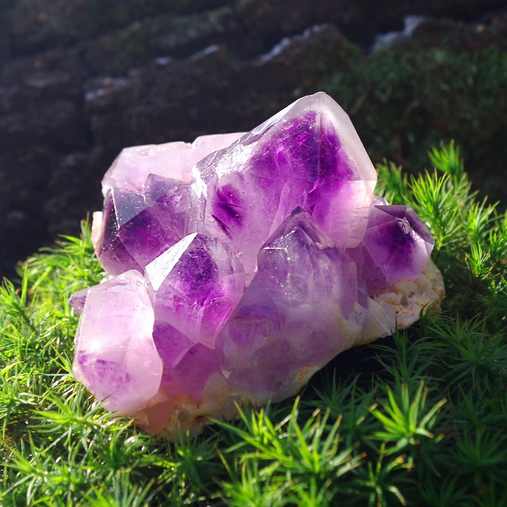 It is best to store your Amethyst out of direct sunlight as its colour can fade over time. As it belongs to the quartz family it is a hard stone (7 on the Mohs scale) and any surface dirt or dust can be cleaned with water and a soft brush. If carried around with you it’s best to keep your crystal in a pouch, or at least in a pocket without coins and keys that may scratch it.