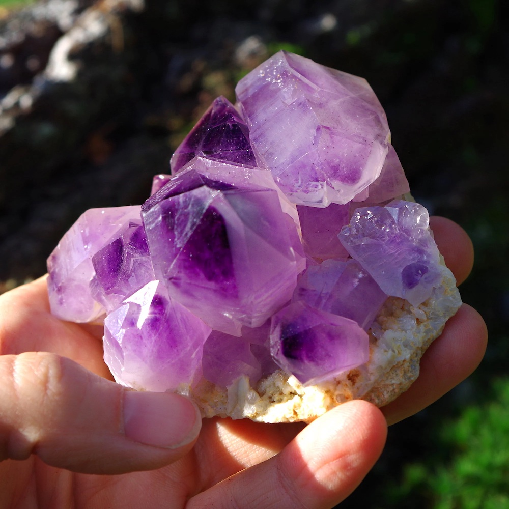 Amethyst belongs to the quartz family and its purple colour comes from the interaction between traces of iron and natural gamma radiation within the earth. It is found in many places around the world with fine specimens coming from Brazil, Uruguay, Madagascar, Zambia, Russia, USA, and now Zimbabwe.